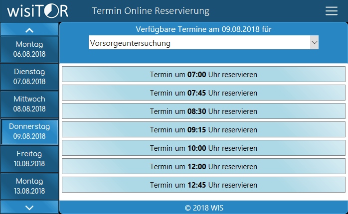 Der Patient wählt auf der Website im Webframe einfach die gewünschte Terminart aus und erhält sofort alle verfügbaren Termine, sortiert nach Tagen, angezeigt.